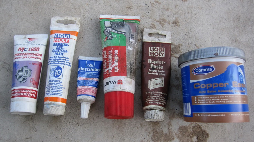 Позиционируется как отечественный аналог TRW PFG110. Создана на основе кальциевых и литиевых мыл. Совместима с гликолевыми тормозными жидкостями. Выпускается смазка в тюбиках объемом 5 грамм. - Liqui Moly Anti-Quietsch-Paste. Универсальная паста для нанесения на направляющие и поршни суппортов. Выпускается в пакетиках объемом 10 грамм. Стоит несколько дороже смазочных материалов такого же назначения, но, по отзывам автовладельцев, лучше противостоит вымыванию и дольше не деградирует.