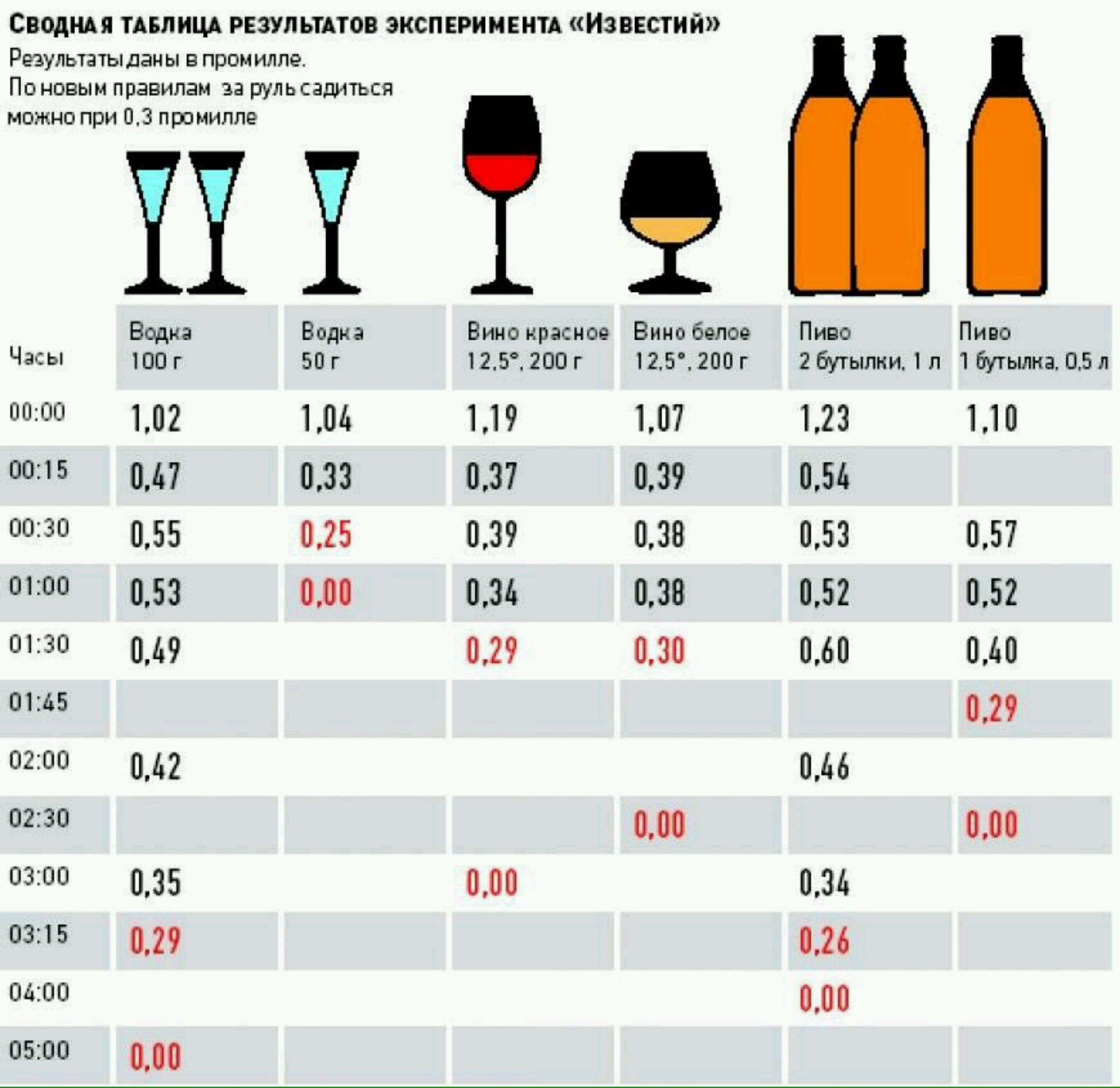 Результат трезвенности достигается быстрее, чем . После выпитых 200 мл качественного напитка, кровь очищается, и последние ферменты покидают организм через 3 часа. Чтобы правильно рассчитать скорость выпитого количества используют специальную таблицу: